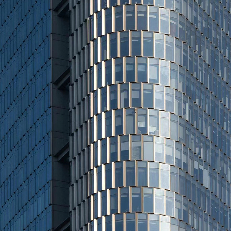 A Parede Cortina de Alumínio utiliza painéis de liga de alumínio como principal material de construção para formar um revestimento para as superfícies externas. O projeto pretende dar um visual moderno ao exterior do edifício, resistência estrutural e alguma customização. É amplamente utilizado em edifícios altos, edifícios comerciais, edifícios culturais, etc. A parede cortina de painel de alumínio é um sistema de parede externa de edifício que usa painéis de liga de alumínio como materiais de revestimento de parede externa. Este sistema geralmente inclui painéis de liga de alumínio, estruturas de suporte, camadas de isolamento e outros componentes relacionados para formar uma decoração geral da parede externa e um sistema de isolamento térmico e acústico. A liga de alumínio é um material leve e de alta resistência, o que faz com que a parede cortina de alumínio tenha boa resistência estrutural e reduz a carga geral do edifício.